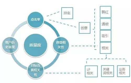 質(zhì)量度優(yōu)化主要從提升廣告的CTR(點(diǎn)擊率)著手,例如提高出價(jià)、提高排名、增加豐富的高級(jí)樣式創(chuàng)意、提高創(chuàng)意相關(guān)性等,能影響質(zhì)量度的提升。可以參考下方這張圖。